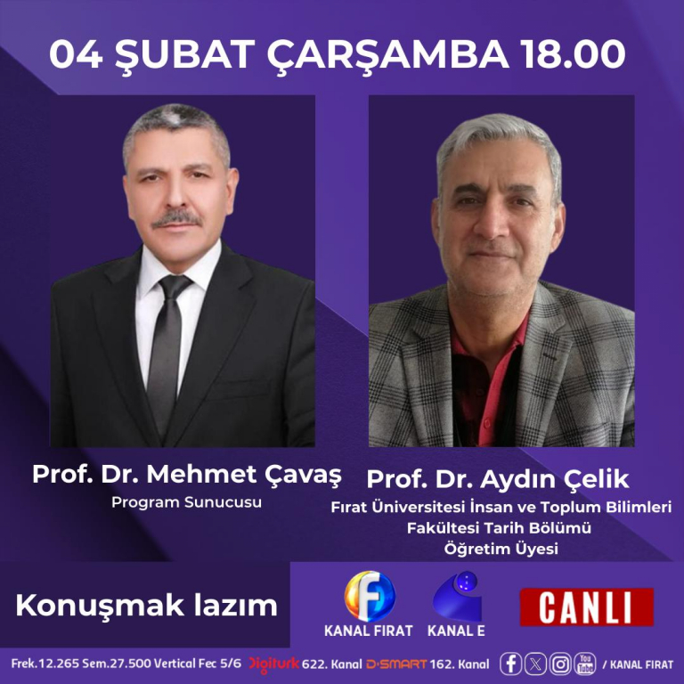Bölümümüz öğretim üyelerinden Prof. Dr. Aydın ÇELİK 04.02.2026 Çarşamba günü 18:00'da Kanal Fırat'taki Konuşmak Lazım programına konuk olacaktır. Programda Ortaçağ İslam Toplumu ve Medeniyeti ele alınacaktır.